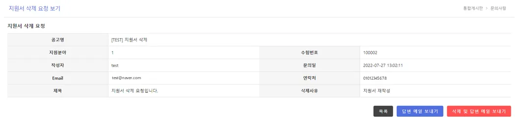지원자가 지원서 재작성이나 지원 취소 등의 사유로, 지원서 삭제를 요청할 수 있는데요!
