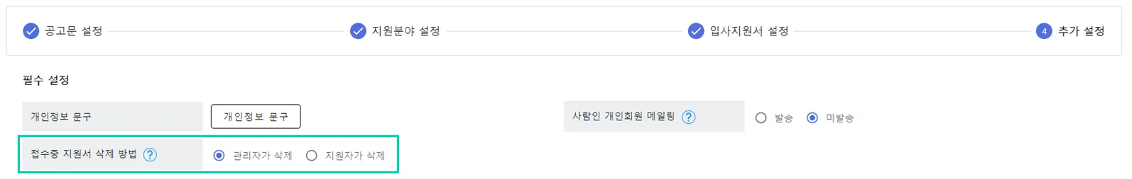 공고를 생성할 때, “4. 추가 설정” 단계에서 “접수 중 지원서 삭제 방법”을 선택할 수 있습니다!