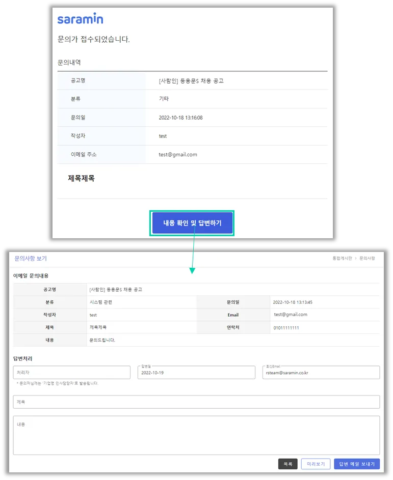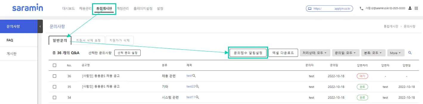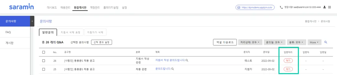 지원자로부터 접수된 문의내역은 통합게시판이나 공고별 게시판관리 메뉴에서 확인 가능한데요.