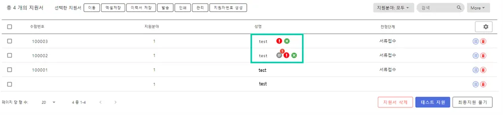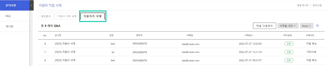 지원자가 직접 삭제로 시스템을 세팅하였더라도, 접수 기간이 지나면 관리자 삭제 건으로 분류가 됩니다.(지원서 접수 마감 이후 삭제요청시, 지원서 삭제 요청 탭에서 해당 내역 확인 가능)