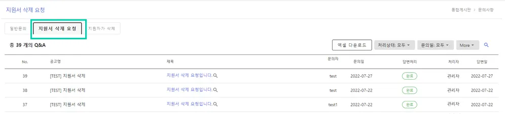 관리자가 삭제하는 부분이기 때문에, 지원서 삭제요청 건으로 분류된 경우에만 해당이됩니다.