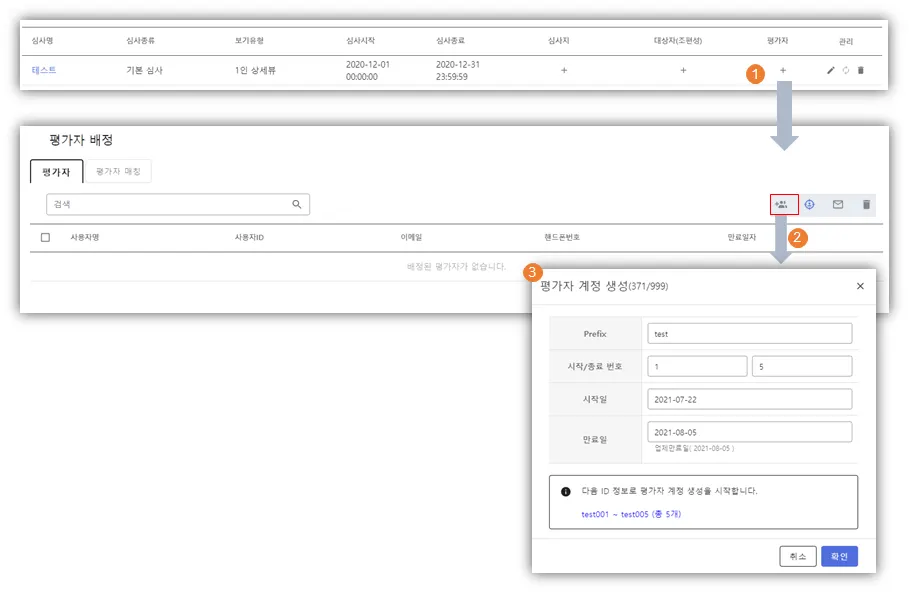 - 시작/종료 번호 : 평가자 계정을 일괄적으로 생성할 경우 갯수 > prefix뒤에 붙을 숫자임