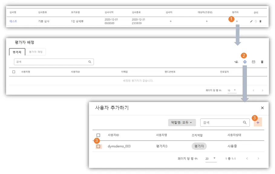 ③ 사용자추가하기에서 평가자 선택 후 +(우측 상단) 클릭