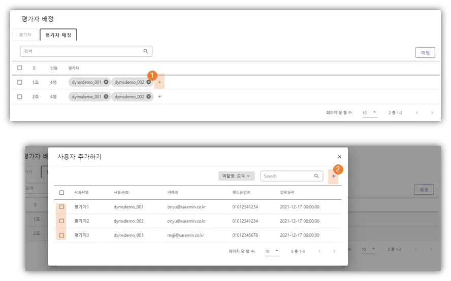 ① 평가자 : + 클릭 > 평가자/평가자 매칭 가능한 화면 보임