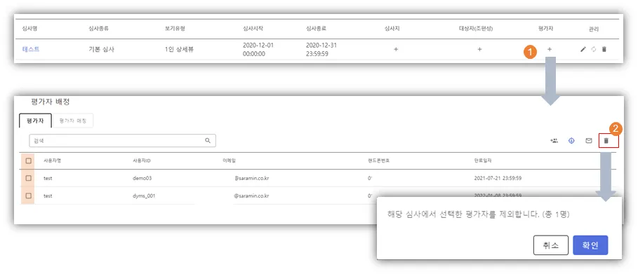 ② 평가 권한 제거 할 평가자 선택 > 제거 버튼 클릭