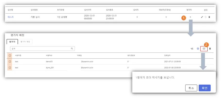 ② 초대 메일 보낼 평가자 선택 > 초대 메일 보내기 버튼 클릭