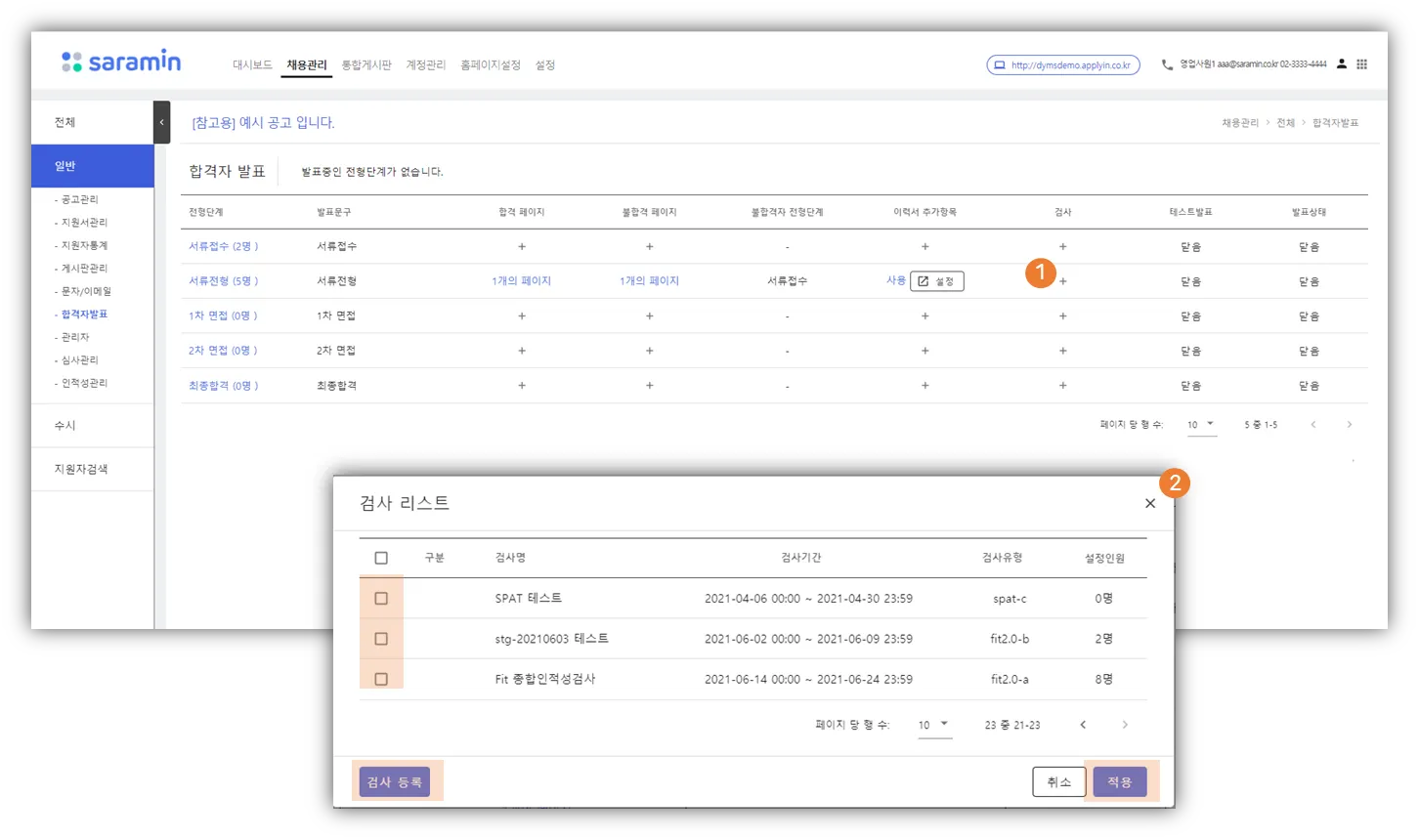 1) 검사 리스트에서 발표 페이지에서 바로 검사 가능한 검사를 고르고 적용 클릭