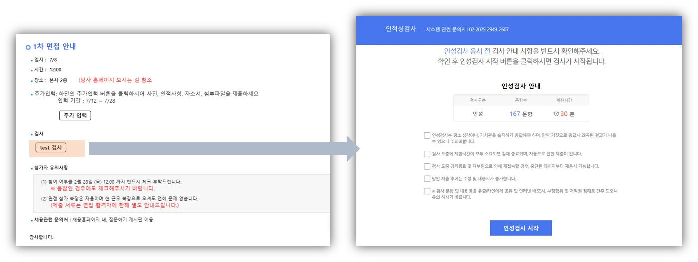 - 합격자 발표 페이지에서 [검사 버튼]을 클릭하면, 해당 지원자가 본인이 대상자로 포함된 검사를 바로 응시할 수 있습니다.