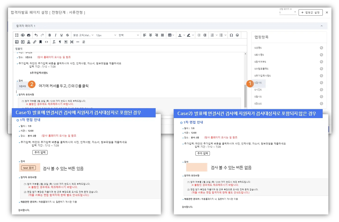- CASE1) 발표에 연결시킨 검사에 대상자로 포함된 지원자는 발표 조회시, 검사응시 버튼이 있음