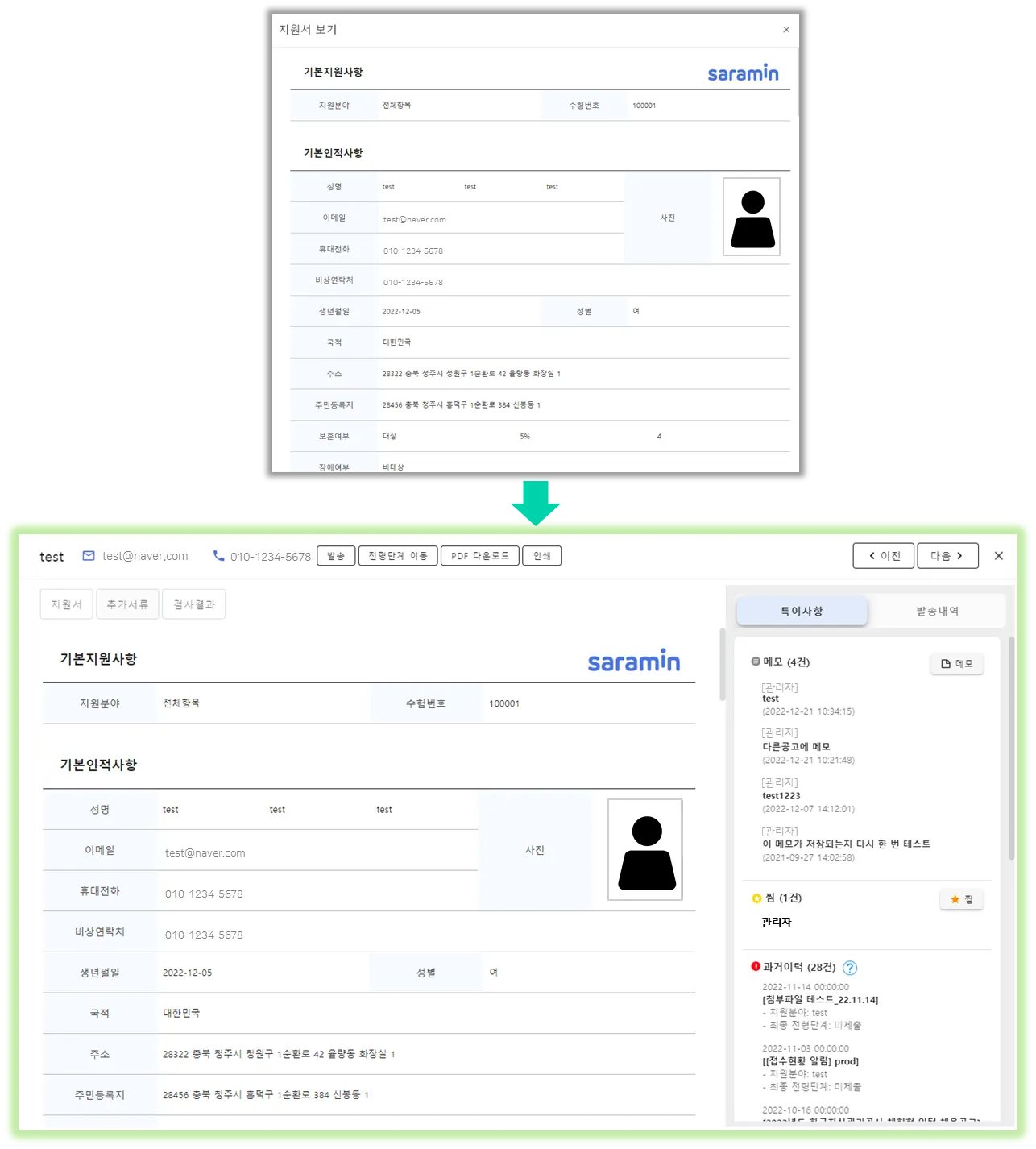 지원서를 확인하면서 지원자에게 연락도 하고 특이사항도 기록해두고 싶은데, 지원서 관리 메뉴를 지원서 뷰에서 활용할 수 없어 불편한 점이 있으셨을텐데요.