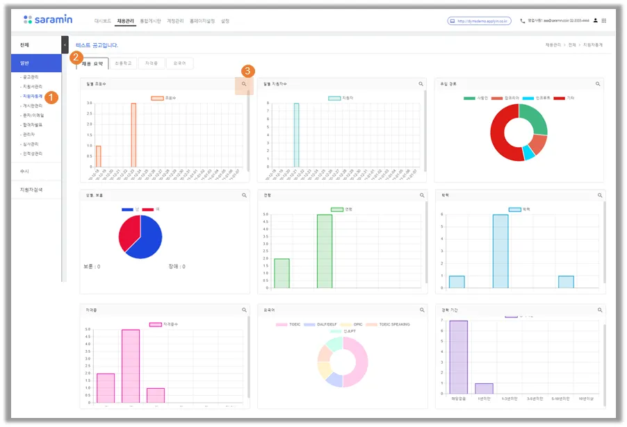 공고별로 지원자에 정보에 대한 통계 및 특정 학교, 자격증에 대한 통계기능을 제공합니다.