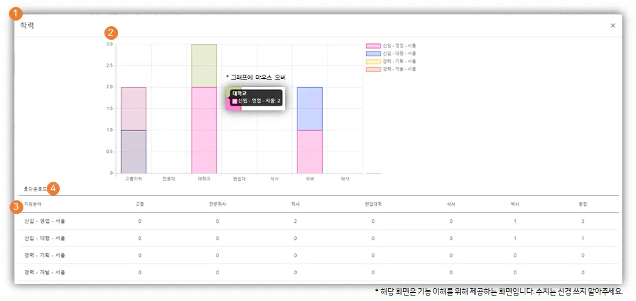 ① 최종학교 통계 화면 : 특정 학교에대한 지원자 필터(통계)가능 (해당 학교가 최종학교인 지원자 수 확인 가능)