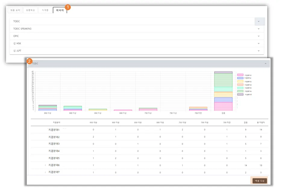 ② 시험 별 통계 화면 : 지원분야별로 통계 결과 제공,