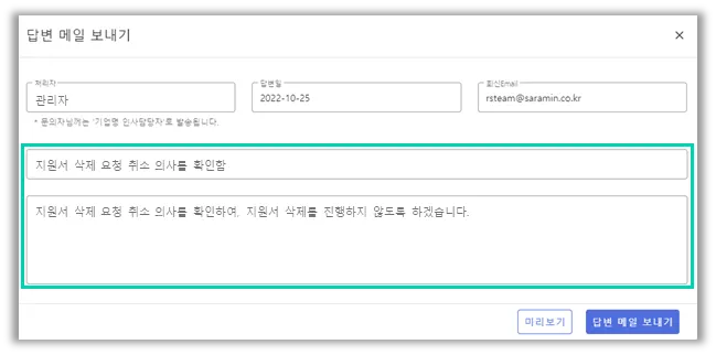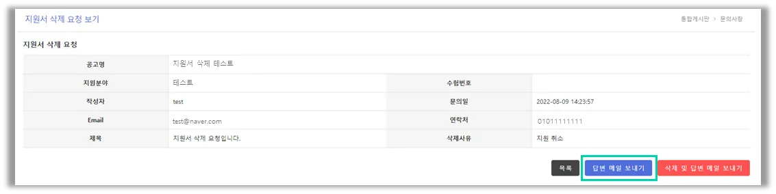 요청 상세보기 페이지에서 [답변 메일 보내기] 버튼을 클릭하여 답변 처리를 해주시면, 지원서 삭제 요청을 하지 않은 지원자와 동일한 상태가 됩니다!