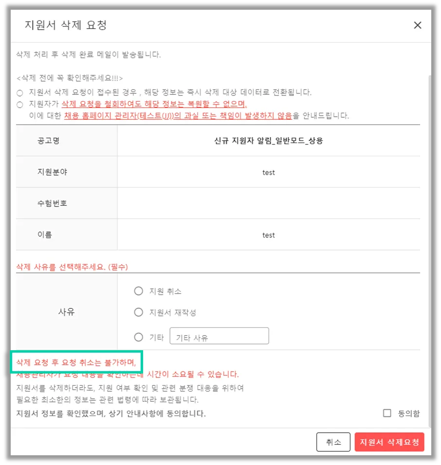 지원자가 채용사이트에서 직접 요청 취소는 못하지만,