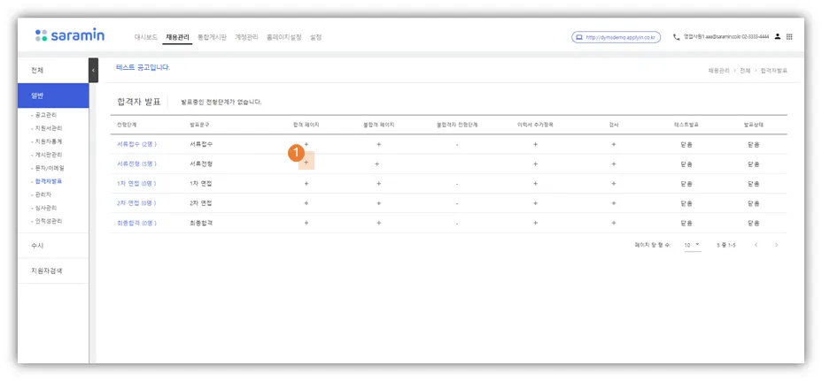 ① 합격자 발표 진행할 전형단계(합격자 기준)의 합격 페이지 + 클릭 > 합격자 페이지 세팅창 열림