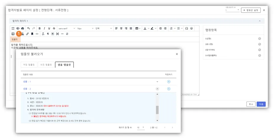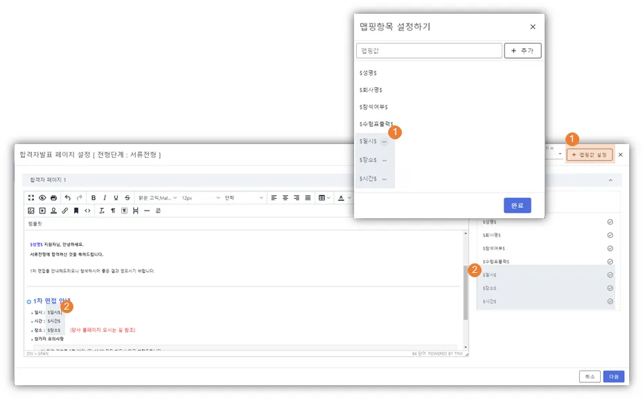 → 해당 항목이 표출되기 원하는 위치에 커서를 두고, 원하는 항목을 클릭 하시면, $맵핑항목$으로 값이 들어갑니다. 실제, 지원자가 확인 할때는 해당 부분이 지원자에 맞게 표출됩니다.