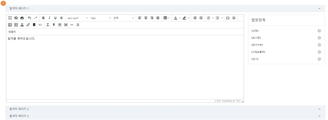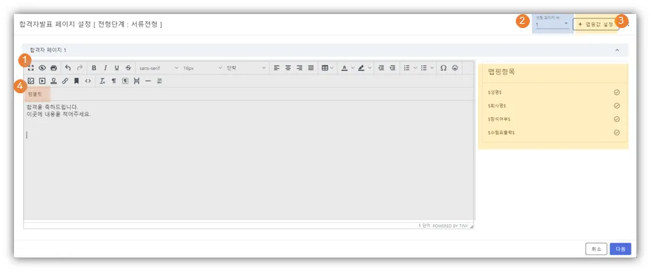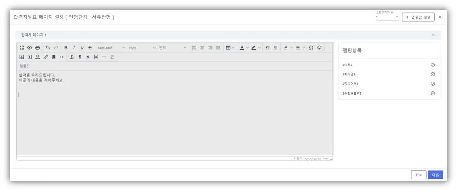 에디터를 사용하여 합격자 발표 문구 세팅 가능
