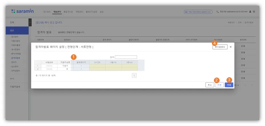 ② 이전 : 합격자 페이지(문구세팅)화면으로 돌아감