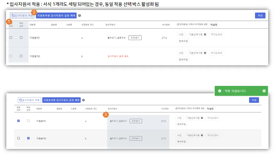 대상 선택 : 동일하게 서식 적용할 지원분야가 있는 곳에 체크