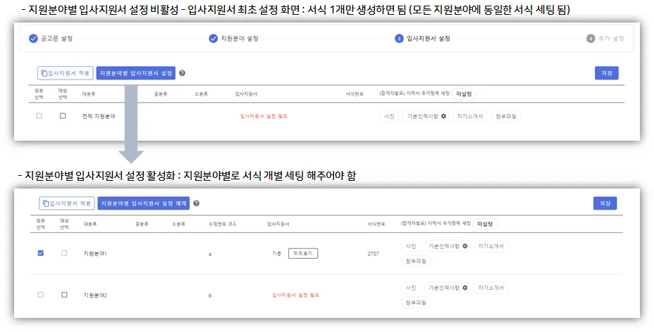 1) 공고에 서식 1개 or 지원분야별로 서식 각각 세팅