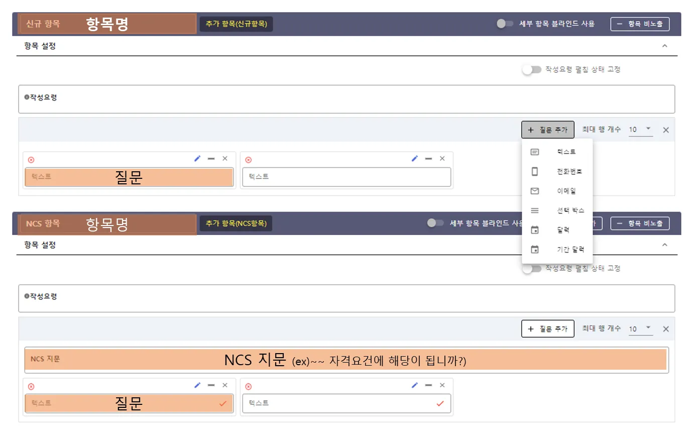 - 질문 유형 : 텍스트박스, 전화번호, 이메일, 선택 박스, 달력, 기간달력