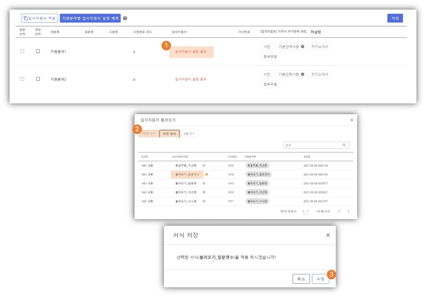 3) 1개의 서식 여러 지원분야에 세팅하기 > 입사지원서 동일적용 사용하기