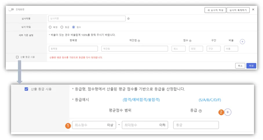 * 등급 기준 추가하는 법 등급 및 등급별 치환 점수 입력 후 + 클릭