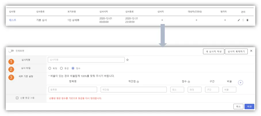 - 비율 : 각 항목의 점수값이 가지는 반영 비율 (비율 사용시, 총 비율이 항상 100%여야함)
