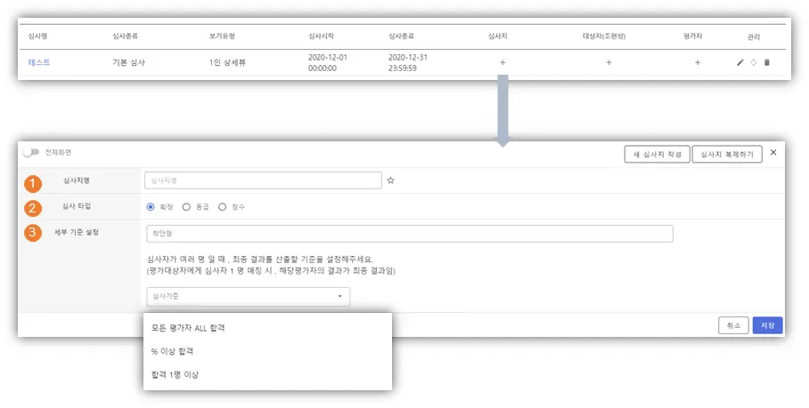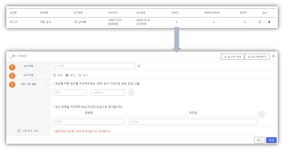 ② 심사 타입 - 점수형 : 인사담당자가 세팅한 점수 기준으로 평가자가 평가값 부여 가능