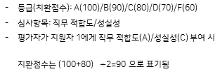 → 점수형 평가 예시에서 최종 80점인(2가지 항목 각각 90, 70 받음) 지원자는
