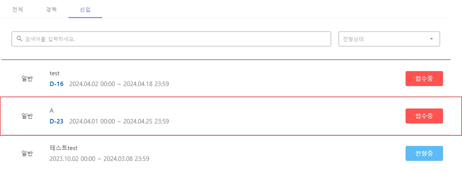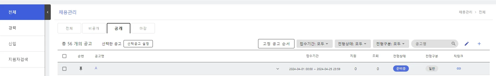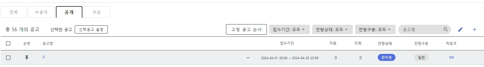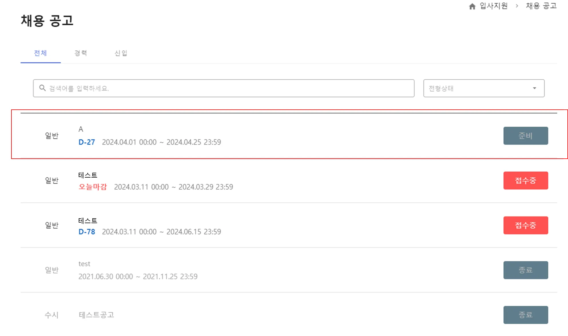 관리자 화면에서는 공고의 상태 별로 리스트가 구성이 되어있어요.